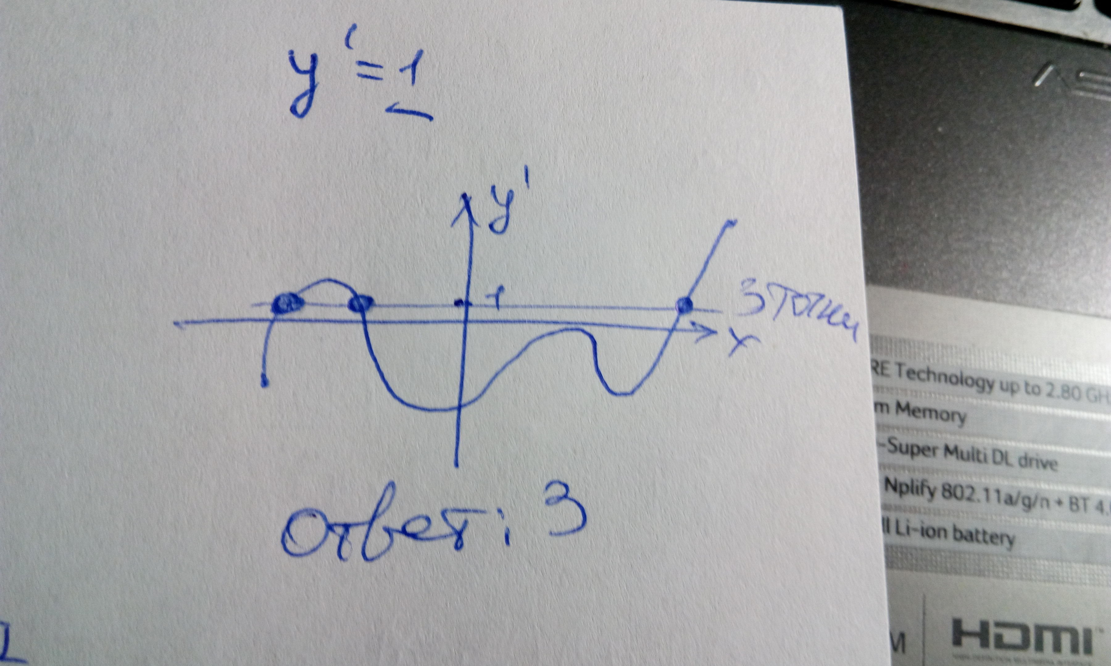 Найдите количество точек, в которых угол наклона касательной к графику функции y=f(x) равен 45 градусов. Можно с полным объяснением, откуда почему и как :)