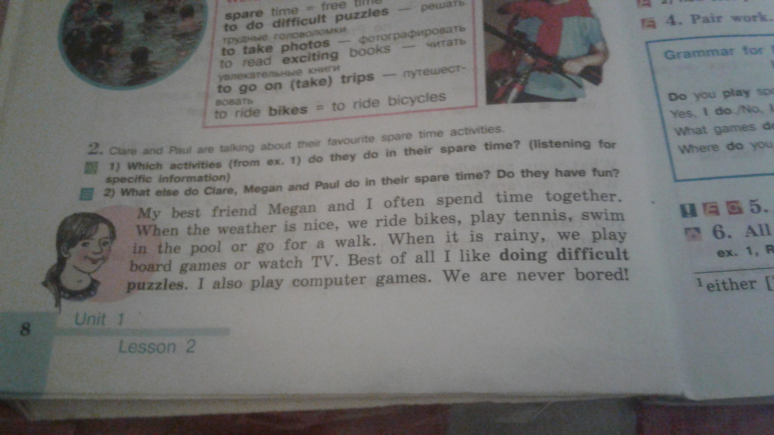 Моя лучшая подруга - Меган и я часто провожу время с ней. Когда погода хорошая мы катаемся на велосипедах, играем в теннис, плаваем в бассейне или гуляем. Когда идёт дождь, мы играем в настольные игры или смотрим телевизор. Больше всего мне нравится собирать трудные пазлы.
