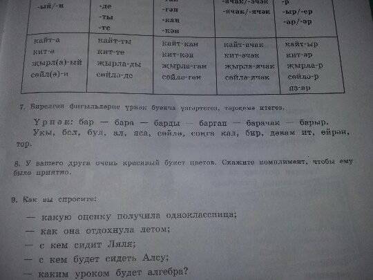 7 бирелгэн фигыльлэрне урнэк буенча узгэртегез, тэржемэ итегез Урнэк: бар-бара-барды-барган-барачак-барыр. Укы,бел,бул,ал,яса,сойлэ,сонга кал,бир,дэвам ит,ойрэн,тор