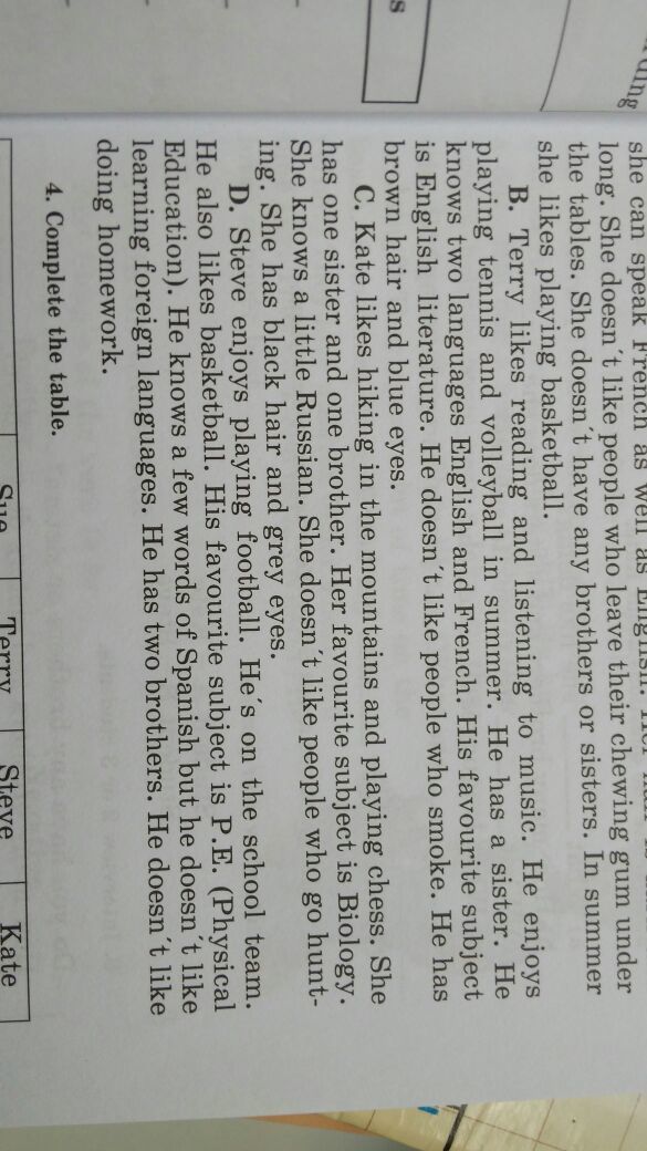 B. Терри любит читать и слушать музыку. Он также любит играть в теннис и волейбол летом. У него есть сестра. Он знает два языка: английский и французский. Его любимый предмет - английская литература. Ему не нравятся люди, которые курят. У него каштановые волосы и голубые глаза.