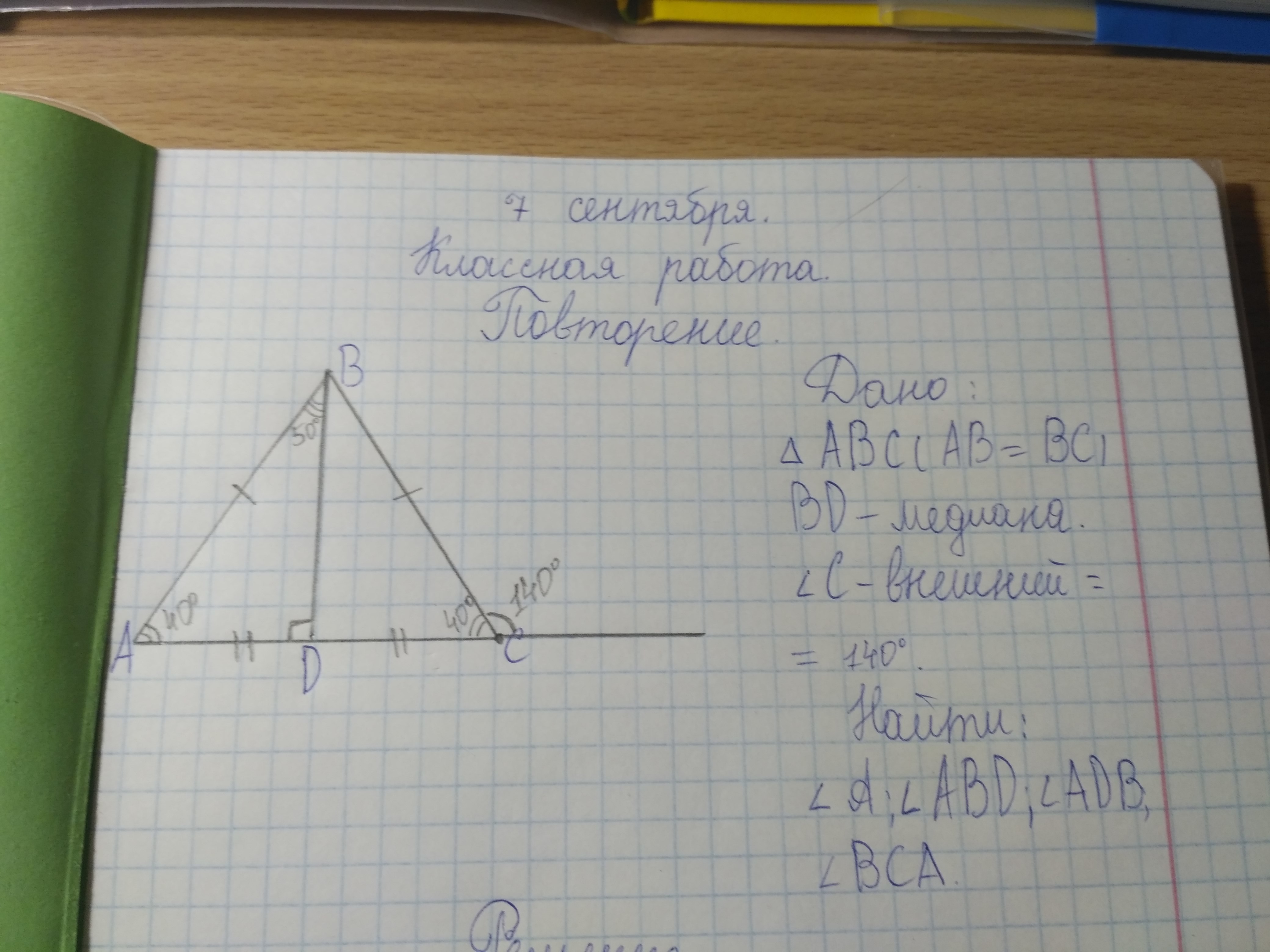1) 180-140=40 (градусов)-как смежный угол, т.к. <BCA=<CAB то он равен 40(градусов)