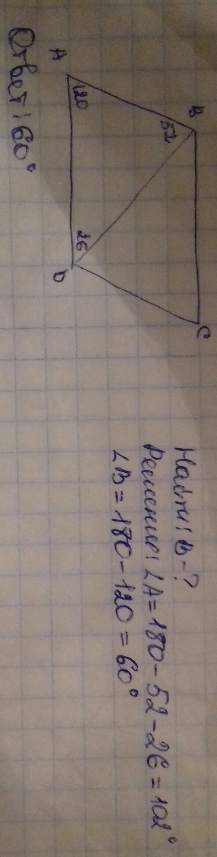 В параллелограмме ABCD диагональ BD со сторонами AB и AD образует углы, равные соответственно 52 градуса и 26 градусов. Чему равна величина угла B?