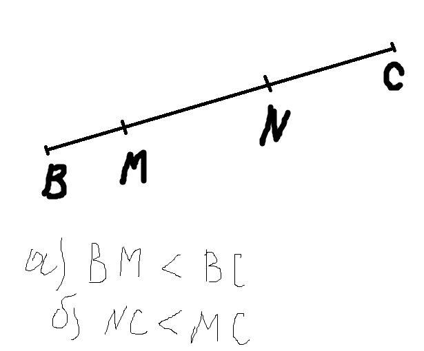 Начертите отрезок BC и отметь на нём точки M и N так, чтобы точка M лежала между точками B и N.Запишите все получившиеся отрезки с концами B,M,N и C.Сравните отрезки. а) BM и BC б) NC и MC