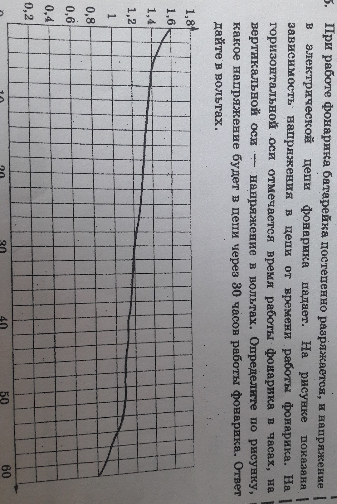 При работе фонарика батарейка постепенно разряжается, и напряжение в электрической цепи фонарика падает.На рисунке показана зависимость напряжения в цепи от времени работы фонарика.На горизонтальной оси отмечается время работы фонарика в часах, на вертикальной оси-напряжение будет в цепи через 30 часов работы фонарика.Ответ дайте в вольтах.
