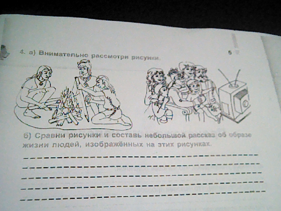 На первом рисунки мы видим первобытных людей. Они еще не знают о многих вещах, о тех кто живет рядом, но мы понимаем, что это возможно VI—V вв. до н.э. (потому что одежда была создана именно тогда). На втором же рисунки мы наблюдаем что вся семья дружно сидит и смотрит телевизор это конечно XXI век. Скорей всего 1980ведь одни из самых первых телевизоров выглядили именно так.