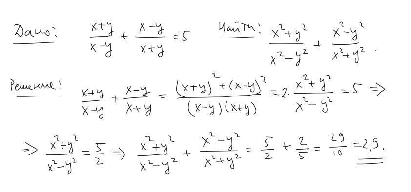 Известно, что $frac{x + y}{x - y}+frac{x-y}{x+y}=5$. Найдите значение выражения $frac{x^2 + y^2}{x^2 - y^2}+frac{x^2-y^2}{x^2+y^2}$