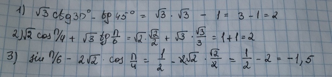 найдите значение выражения: 1)√3ctg30°-tg45°