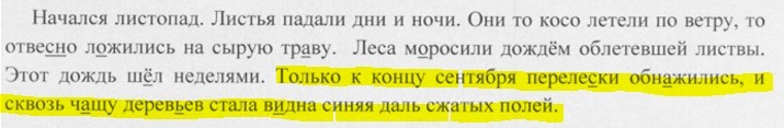 1. Двусост., распр. Основа : перелески обнажились - =. Обст. : к концу-.-.- Дополн : сентября ---. 2. Двусост., распр. Стала видна даль = -. Дополн. : даль, полец, сквозь чащу, деревьев ---- Определение : синяя , сжатых ~