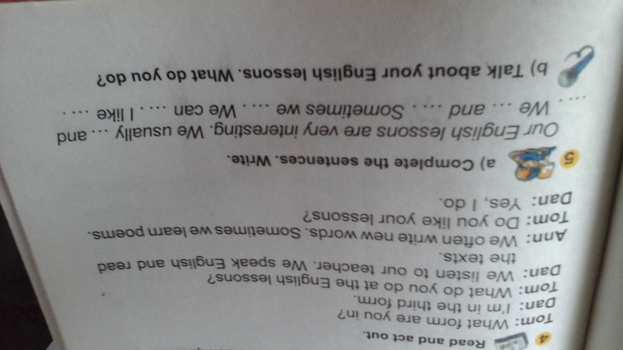 We usually listen to our teacher and read the texts. We often write new words and teach them. Sometimes we learn poems. We can speak English. I like it.