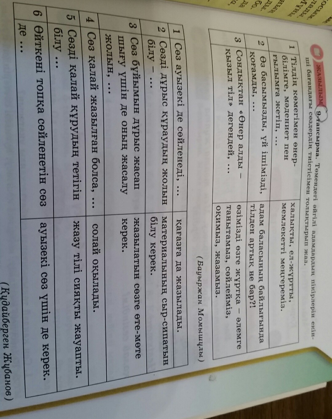 5 Класс. 9 тапсырма. Томендегi айгiлi адамдардын пiкiрлерiн екiншi багандагы создердiн тиiстiсiмен толыктырып жаз.