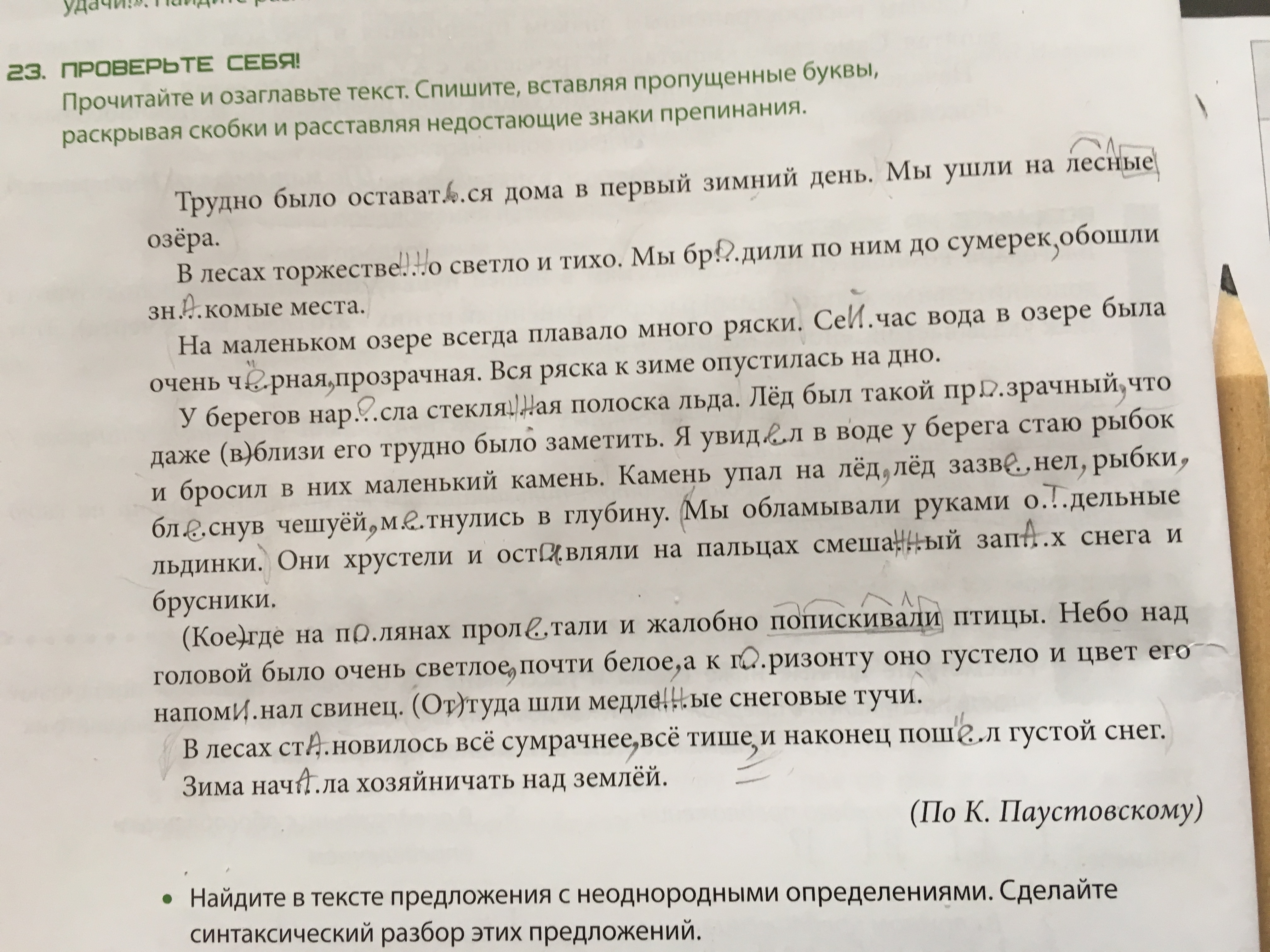Трудно было оставаться дома в первый зимний день. Мы ушли на лесные озера. В лесах было торжественно,светло и тихо.Мы бродили по ним до сумерек,обошли знакомые места. На маленьком озере всегда плавали много ряски.Сейчас вода в озере была очень черная прозрачная. Вся ряска к зиме опустилась на дно. У берегов наросла стеклянная полоска льда.Лед был такой прозрачный,что даже вблизи его было трудно заметить.Я увидел в воде у берега стаю рыбок и бросил в них маленький камень.Камень упал на лед,лед зазвенел,рыбки блеснув чешуей метнулись в глубину.Мы обламывали руками отдельные льдинки.Они хрустели и оставляли на пальцах смешанный запах снега и брусники. Кое-где на полянках перелетали и жалобно попискивали птицы.Небо над головой было очень светлое,белое,а к горизонту оно густело,и цвет его напоминал свинец.Оттуда шли медленные снеговые тучи. В лесах становилось все сумрачно,все тише,и,наконец,пошел густой снег. Зима начала хозяйничать над землей.