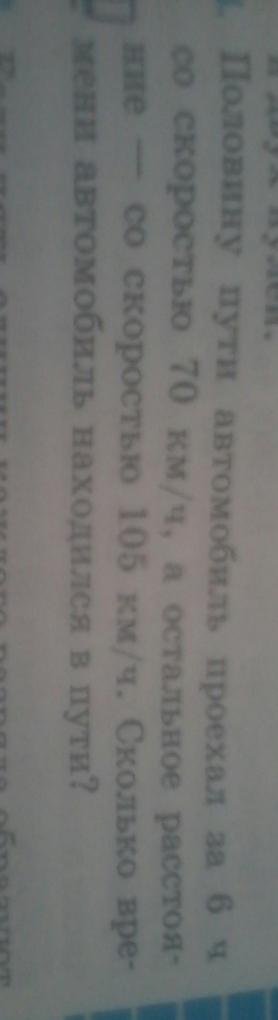 70×6=420км,первая половина пути, остаётся такая же 2,значит она тоже равна 420км.,эти 420км.надо поделить на 105,чтобы понять за сколько часов машина проедет вторую часть пути, получится 4 часа,следовательно машина проедет весь путь за 10 часов(6+4).