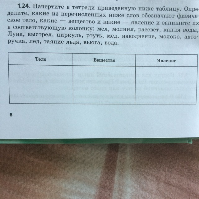 Мел- тело, молния-явление, рассвет-явление, капля воды-вещество, луна-тело, выстрел-явление, циркуль-тело, ртуть-вещество, мед-тело, наводнение-явление, молоко-тело, авторучка-тело, лед-вещество, таяние льда-явление,вьюга-явление, вода-вещество.