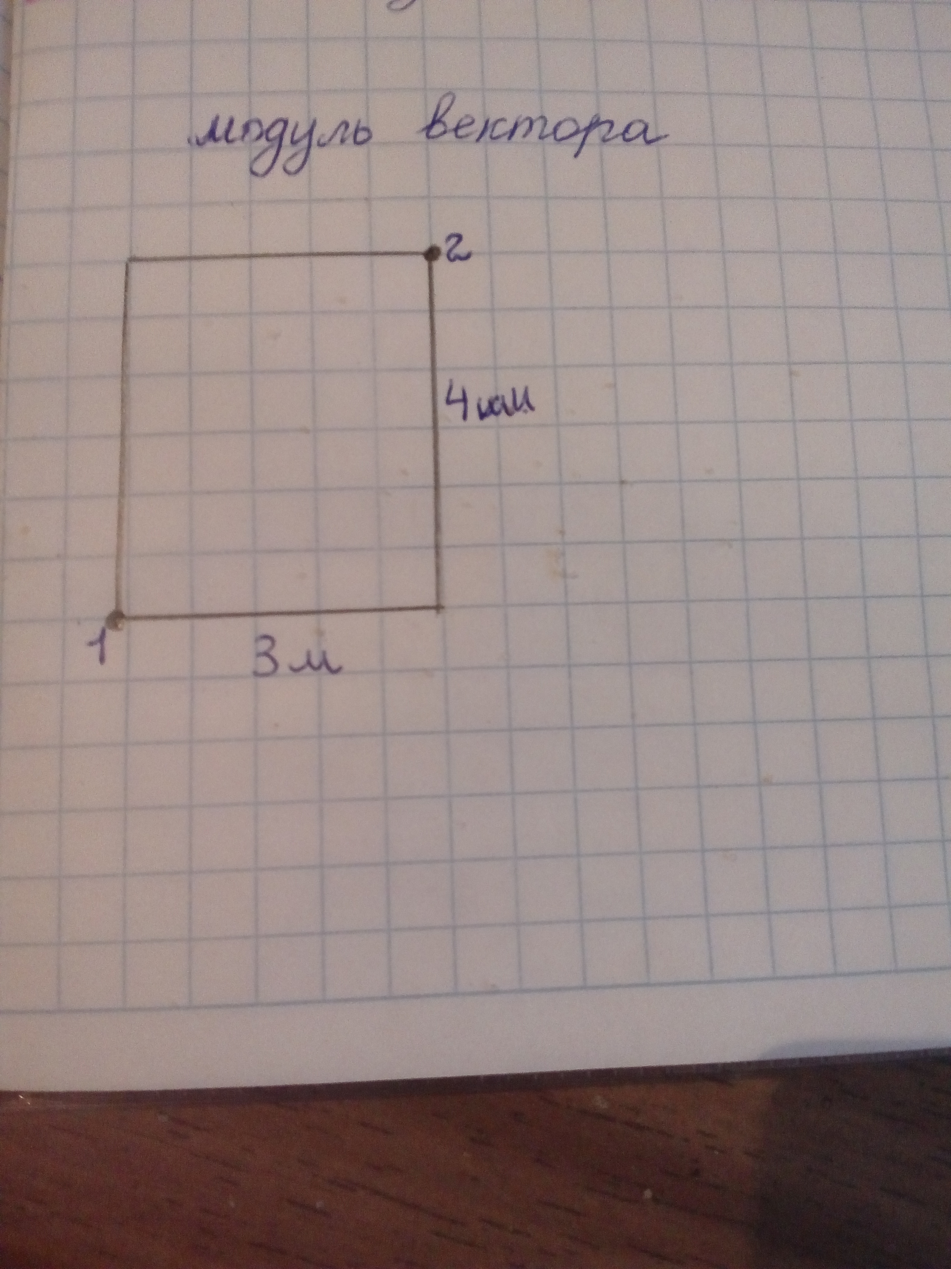 Вектор будет идти от точки 1 к точке 2. Получаем прямоугольный треугольник и решаем по теореме пифагора. вектор^2=3^2+4^2=9+16=25