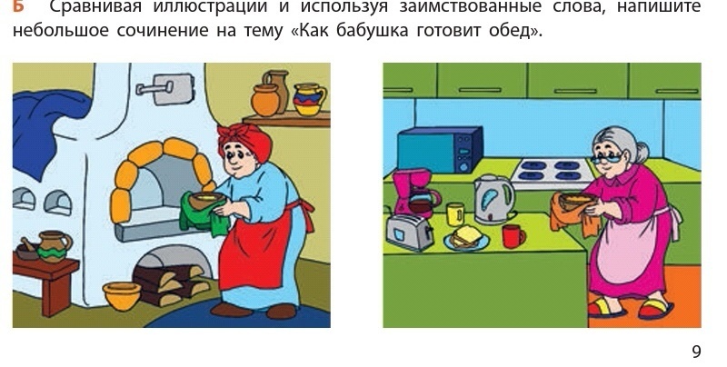 На первой картинке видно что бабушка готовит обед в деревне. ибо печки бывают именно там.И сразу можно по кухне понять что готовится обед не с приборами новейших технологий.А во второй картинке видно что вокруг бабушки приборы такие как :блендер электрический чайник и т.д. . Сразу можно предположить что она живет в городе.