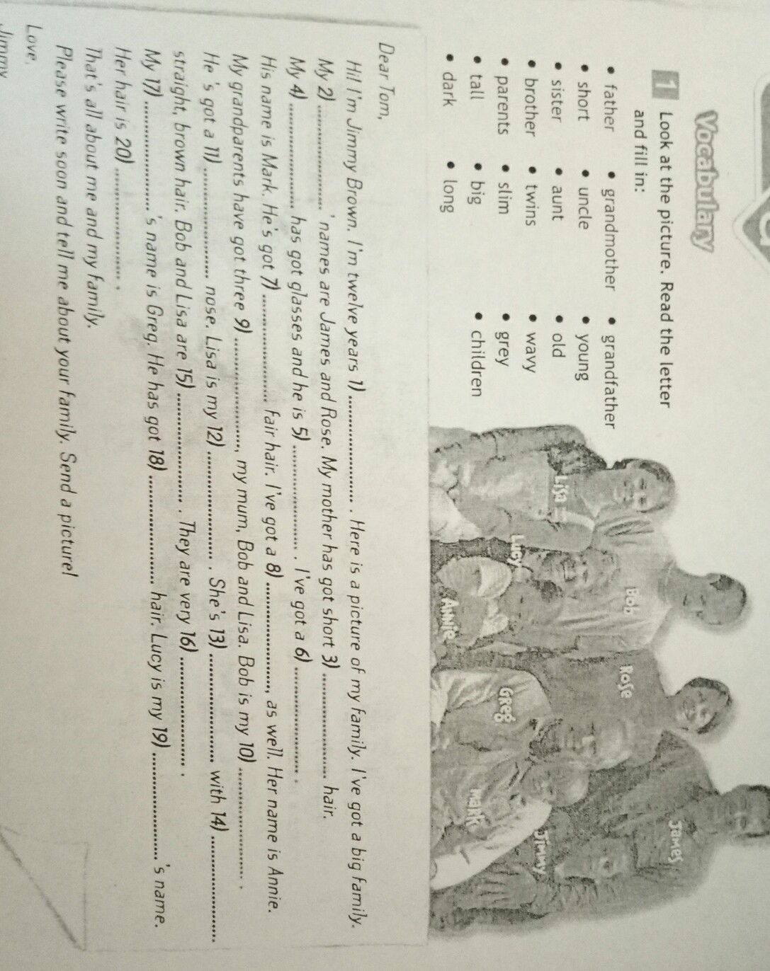 1)old 2)parents 3)grey 4)father 5)tall 6)brother 7)short 8)sister 9) hildren 10)uncle 11)big 12)aunt 13)slim 14)long 15)twins 16)young 17)grandfather 18)dark 19)grandmother 20)wavy