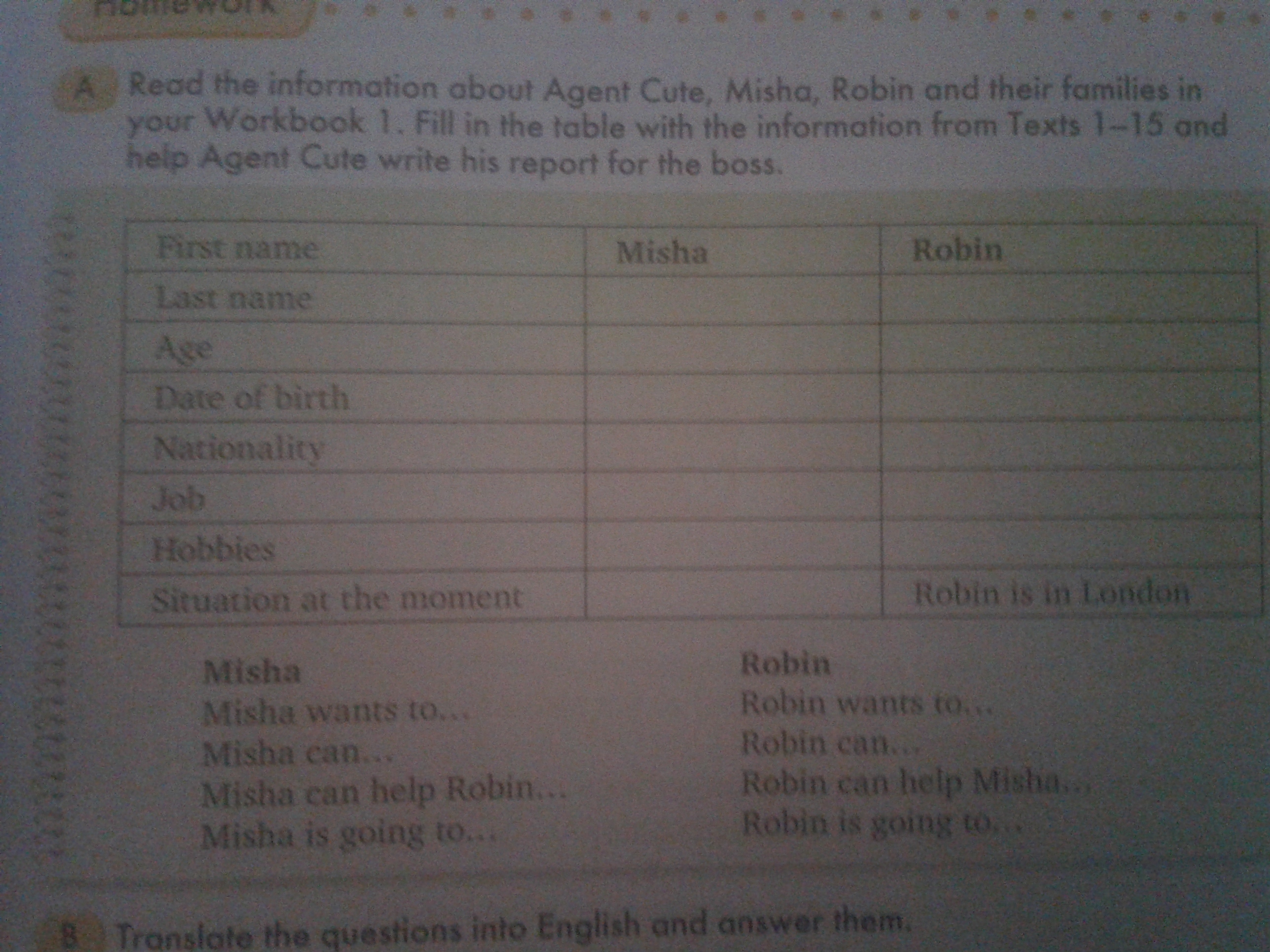 Дословный перевод задания "Прочитай информацию про Агента Кьюта, Мишу, Робина и их семьи в Рабочей тетраде 1. Заполни таблицу, используя информацию из текстов 1-15 и помоги Агенту Кьюту написать его ответ своему начальнику." Не видя текстов 1-15 нереально заполнить таблицу. Вероятно, Рабочая тетрадь 1 та самая, в которой написано это упражнение, а тексты 1-15 находятся до таблицы.