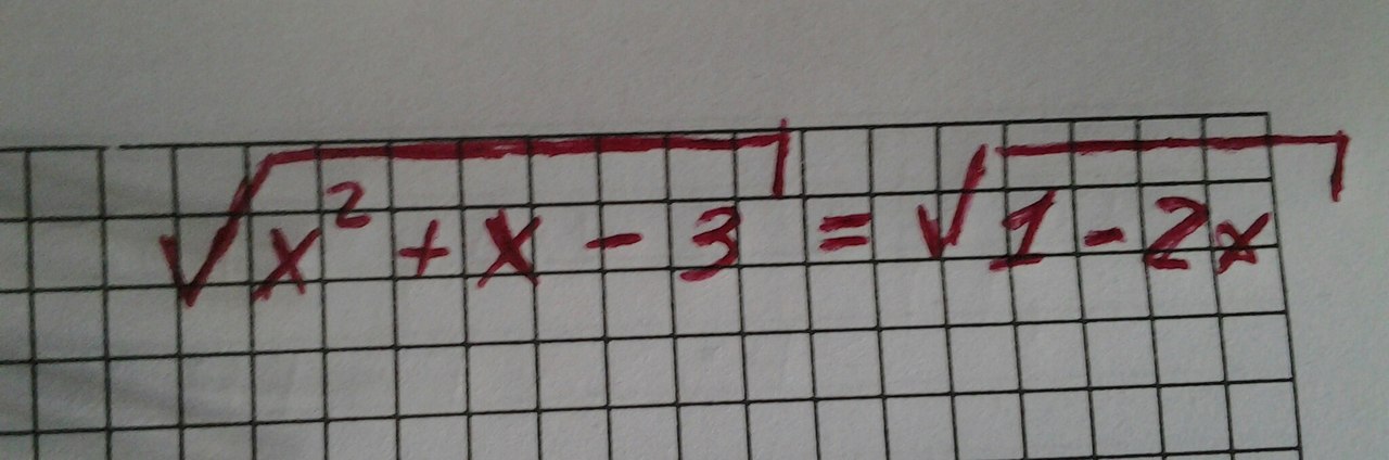 Надо возвести в квадрат обе части уравнения, причём можно найти ОДЗ: подкоренные выражения больше или равны 0.![1-2x geq 0, x^2+x-3 geq 0\x leq frac{1}{2}, xin (-infty,frac{-1-sqrt{13}}{2}]U[frac{-1+sqrt{13}}{2})\frac{-1-sqrt{13}}{2}=-2,3 ; frac{-1+sqrt{13}}{2}=1,3\ 1-2x geq 0, x^2+x-3 geq 0\x leq frac{1}{2}, xin (-infty,frac{-1-sqrt{13}}{2}]U[frac{-1+sqrt{13}}{2})\frac{-1-sqrt{13}}{2}=-2,3 ; frac{-1+sqrt{13}}{2}=1,3\](https://tex.z-dn.net/?f=1-2x+geq+0%2C+x%5E2%2Bx-3+geq+0%5Cx+leq+frac%7B1%7D%7B2%7D%2C+xin+%28-infty%2Cfrac%7B-1-sqrt%7B13%7D%7D%7B2%7D%5DU%5Bfrac%7B-1%2Bsqrt%7B13%7D%7D%7B2%7D%29%5Cfrac%7B-1-sqrt%7B13%7D%7D%7B2%7D%3D-2%2C3+%3B+frac%7B-1%2Bsqrt%7B13%7D%7D%7B2%7D%3D1%2C3%5C)