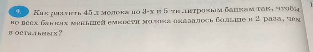 Пусть 3-х литровых банок было х штук, а 5-ти литровых - у штук. Зная, что всего 45 литров молока имеем первое уравнение 3х+5у=45. Т.к. во всех 3-х литровых банках в 2 раза больше молока, чем в 5-ти литровых, имеем второе уравнение 3х=10у