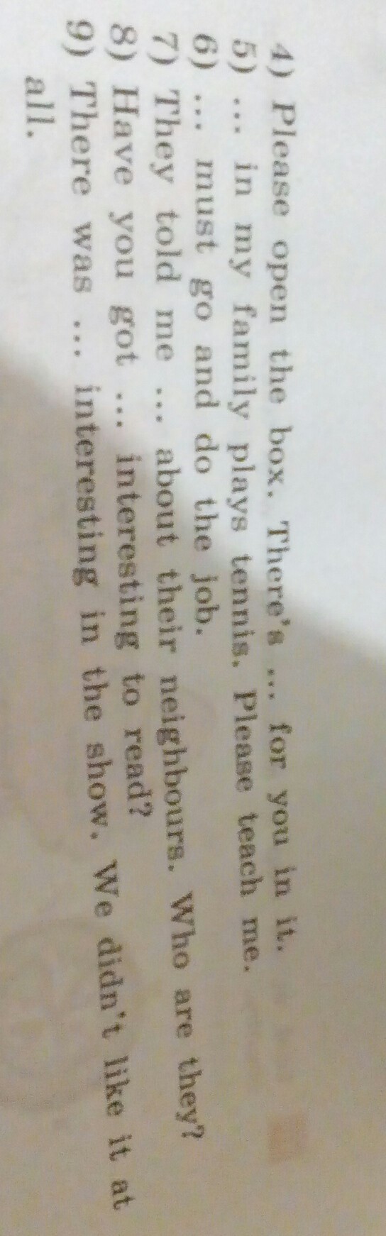 Complete the sentences. Use nobody, anybody, somethink, anythink, nothink.