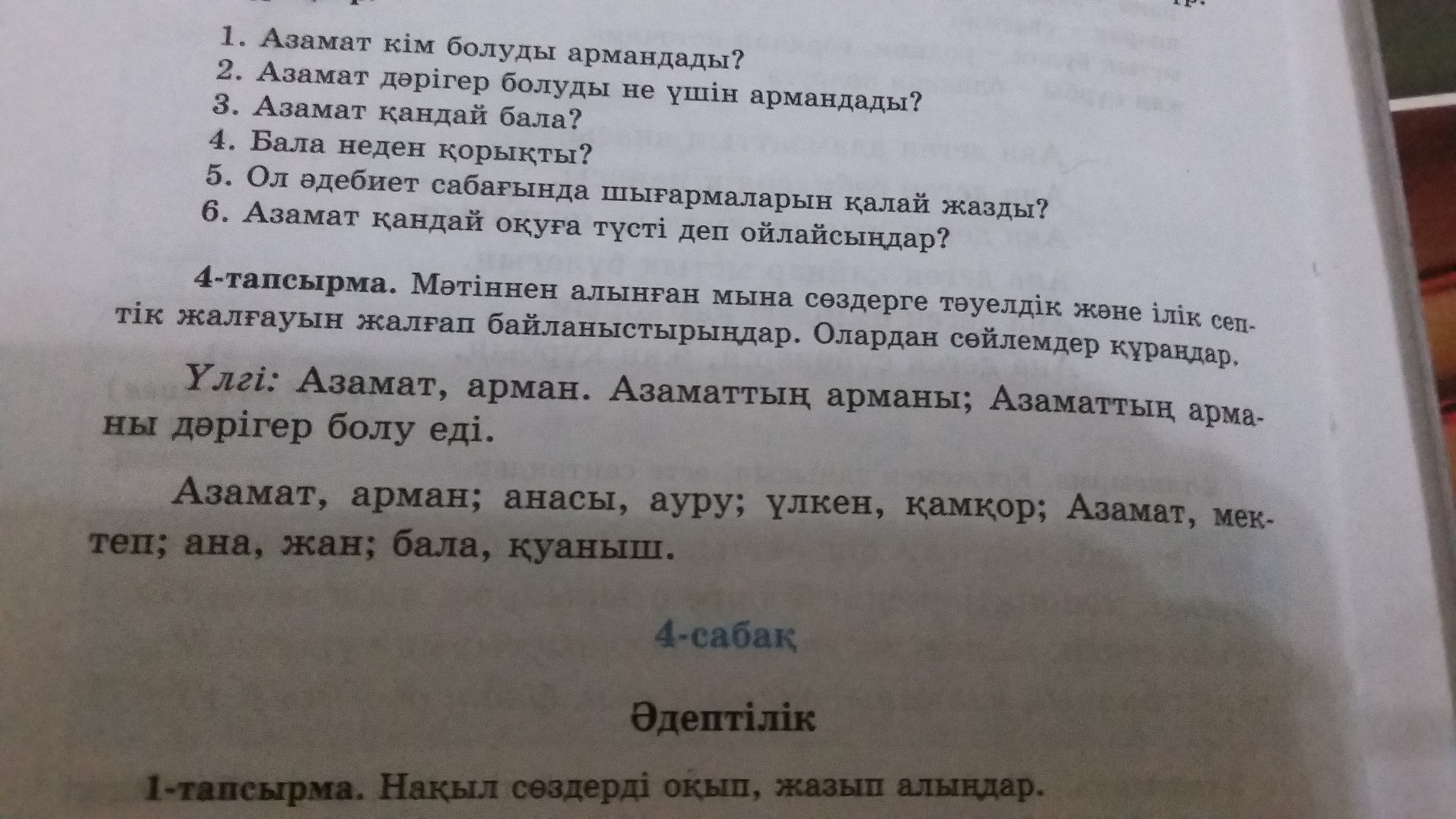 Азамат,арман.Азаматтың арманы дәрігер болу еді.Азамат анасы.Азаматтың анасының жасы отызда..Азаматтың қамкор досы бар.Азаматтың үлкен ойыншығы бар.Азаматтың мектепте оқийды.Азаматтың анасы әдемі.Азаматтың жан досы бар.Азаматтың баласы бар.Азаматтың қуанышты жаңалық бар