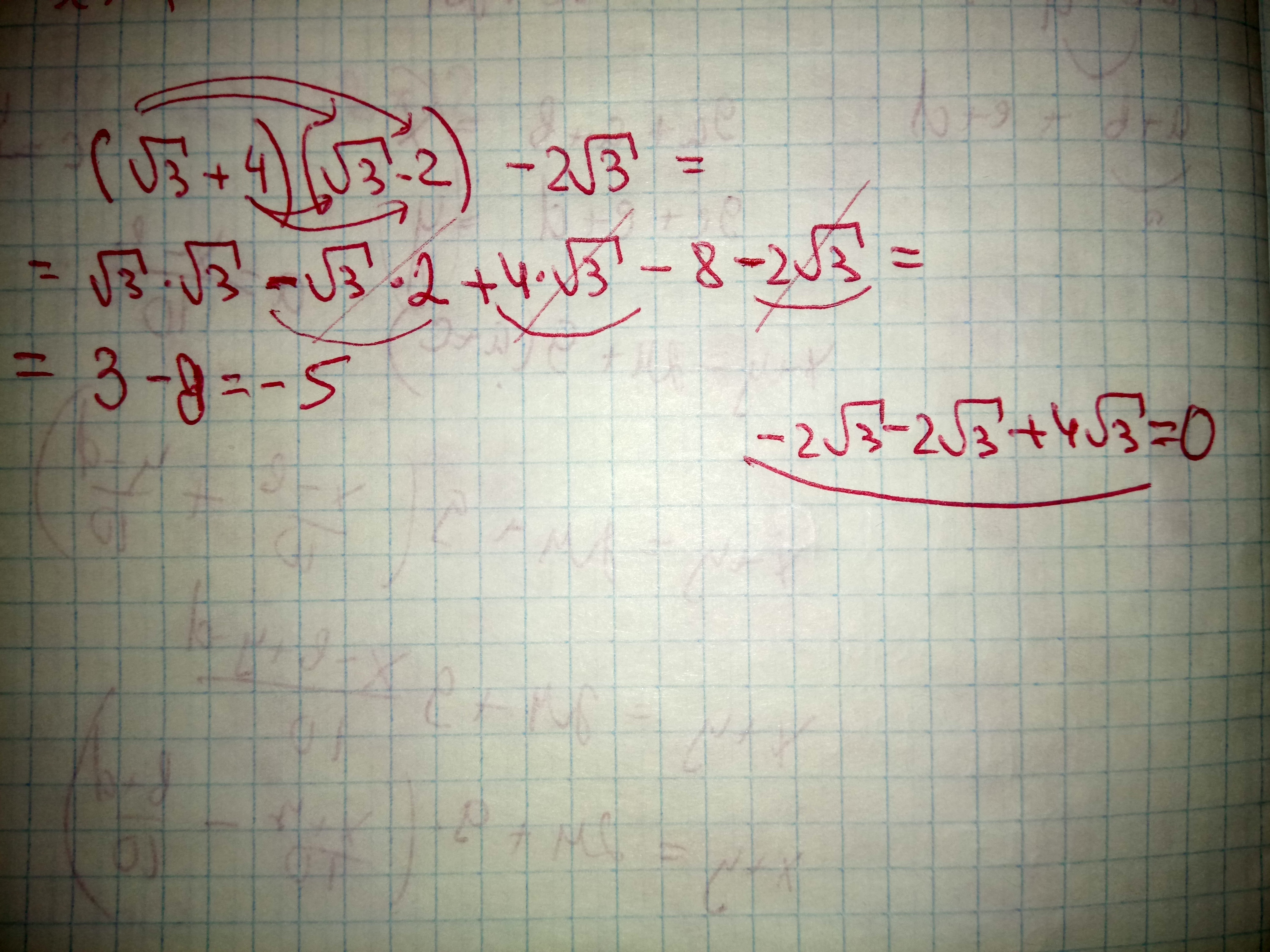 ВНИМАНИЕ! Срочно нужно решение этого примера!!! (Нужно упростить, по возможности розписать) 1) (√3+4)(√3-2)-2√3