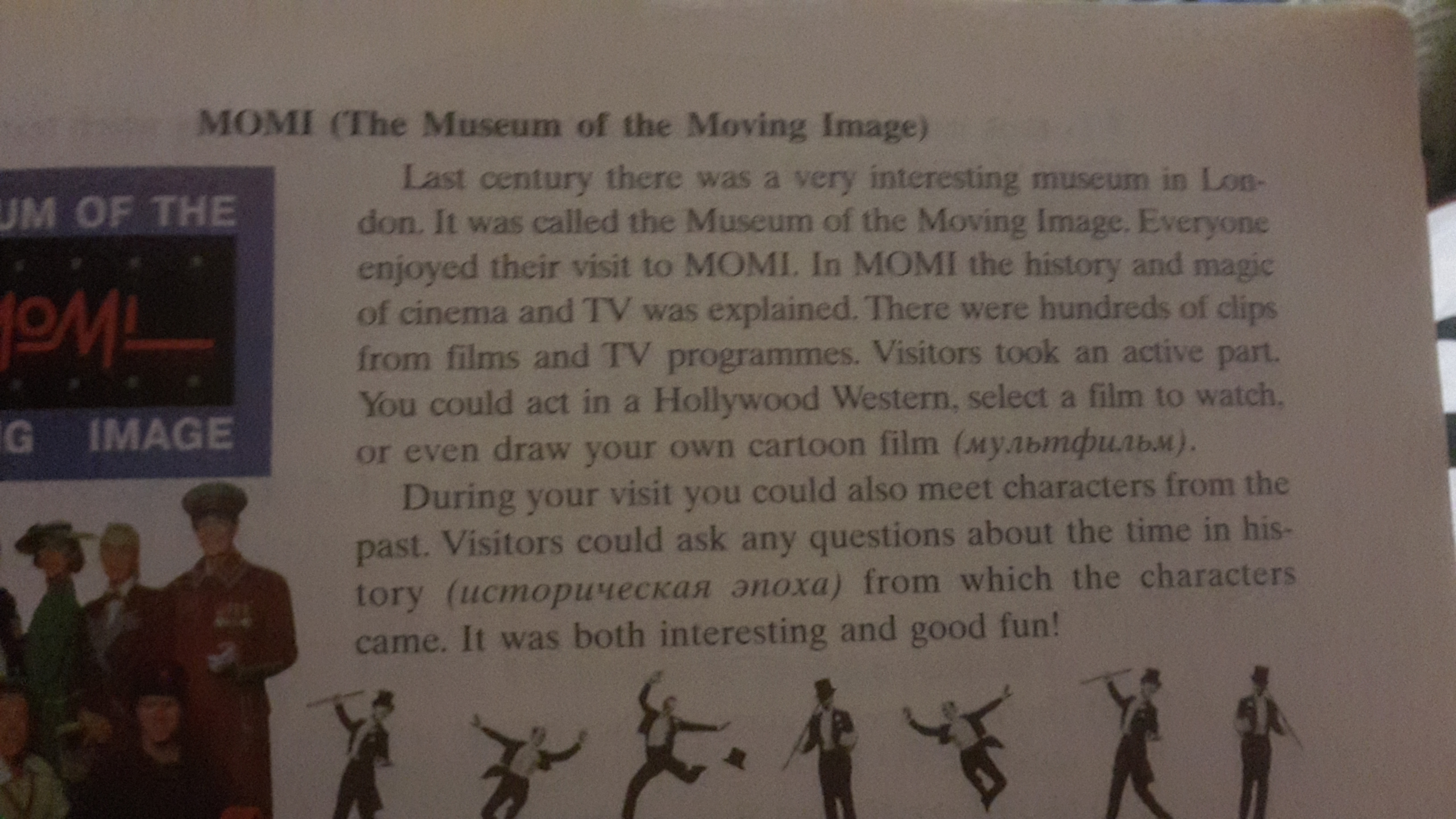 В прошлом столетии в Лондоне существовал очень интересный музей. Он назывался Музеем движущегося изображения. Каждый человек получал удовольствие от посещения МДИ. В МДИ рассказывали об истории и волшебстве кино и телевидения. Существовали сотни нарезок из фильмов и телевизионных программ. Посетители принимали активное участие в этом. Вы могли сыграть в голливудском вестерне, выбрать фильм для просмотра или даже нарисовать свой собственный мультфильм.