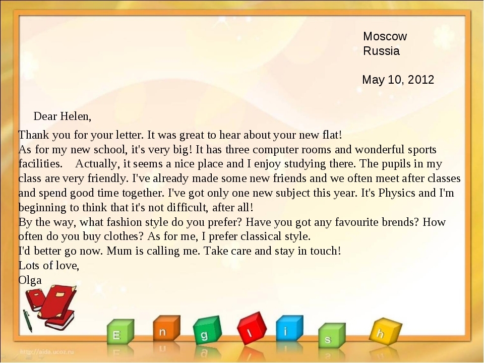 Спасибо за письмо. Было приятно услышать о твоей новой квартире!