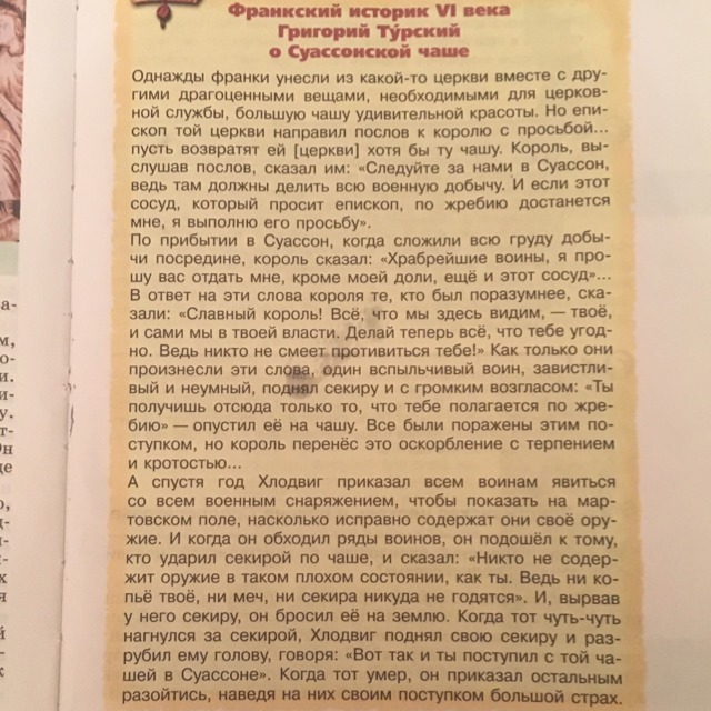 Почему воин оказался таким несговорчивым? Только ли из-за дурного характера? Отчего Хлодвиг не забрал чашу силой? Почему лишь спустя много времени он расправился со своим обидчиком? Какую роль в этой истории сыграло то обстоятельство, что она произошла после военного похода франков?