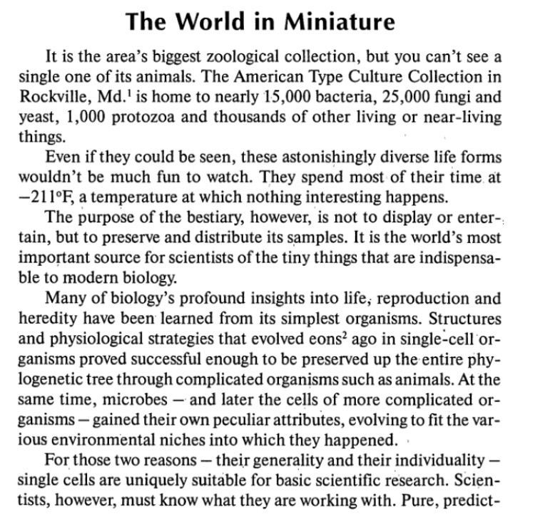Это большая зоологическая коллекция, но вы не можете видеть ни одного из своих животных. Американская Коллекция типовых культур в Роквилле, штат Мэриленд.1 является домом для почти 15 000 бактерий, 25,000 грибов и дрожжей, 1,000 простейших и тысячи других живых или почти живых существ.Даже если они могли быть замечены, эти поражают своим многообразием форм жизни не было бы весело смотреть. Они проводят большую часть своего времени на -211°F, а температура, при которой ничего интересного не происходит.Цель бестиарий, однако, не для показа или отдыхать, но, чтобы сохранить и распространить свои образцы. Он является наиболее важным источником для ученых крошечные вещи, которые незаменимы в современной биологии.Многие глубокие выводы биологии в жизни, размножение и наследственность были извлечены из его простейших организмов. Структур и физиологических стратегий, которые развивались назад в одноклеточные организмы оказались достаточно успешными, чтобы быть сохранены все филогенетическое дерево на основе сложных организмов, таких как животные. В то же время микробы, а позднее — клетки более сложных организмов, приобрел свои специфические атрибуты, развивается, чтобы соответствовать различных экологических нишах, в которые они происходили.По этим двум причинам — их обобщенности, а их индивидуальность — единичные клетки уникально подходит для фундаментальных научных исследований. Ученые, однако, должны знать, что они работают. Чисто, предсказать.