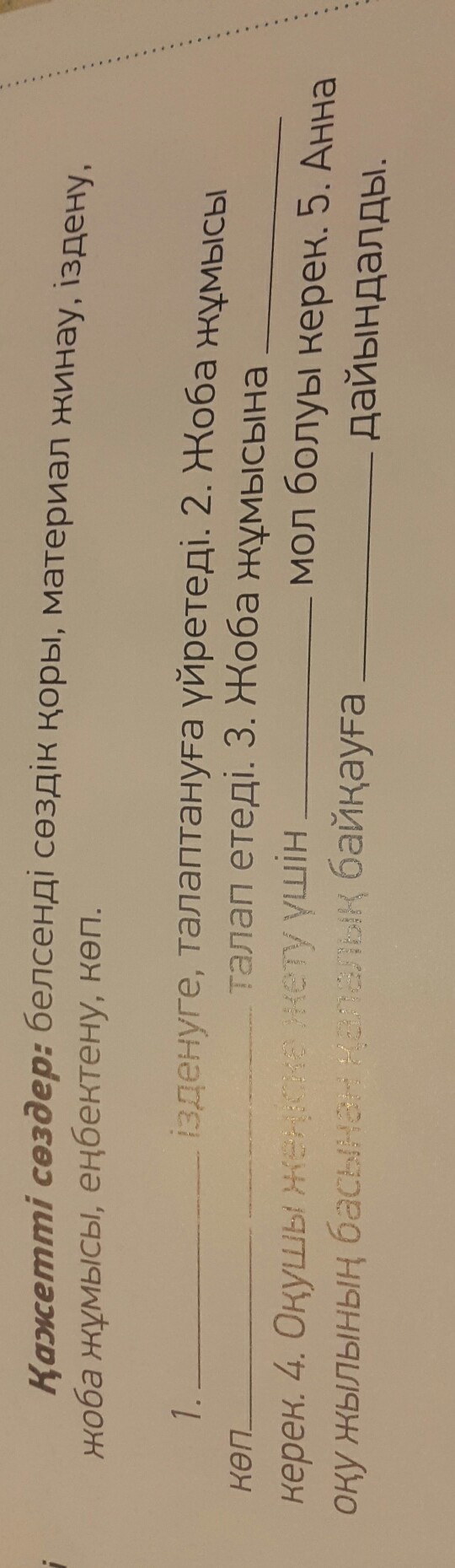 1. Жоба жұмысы ізденуге, талаптануға үйретеді. 2. Жоба жұмысы көп іздену талап етеді. 3. Жоба жұмысына материал жинау керек. 4. Оқушы жеңіске жетуі үшін белсенді сөздік қоры мол болуы керек. 5. Анна оқу жылының басынан қалалық байқауға көп дайындалады.