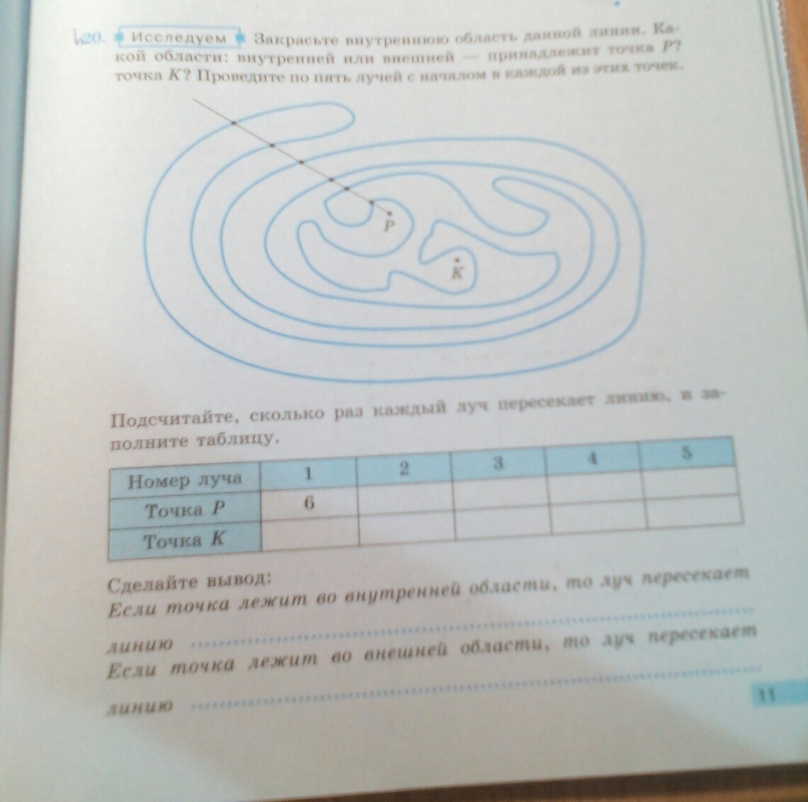 помогите пожалуйста плиз срочно задание: закрасте внутреннюю область данной линии . какой области :внутренней или внешней -принадлежит точка P ? , точка K? Проведите по пять лучей с началом в каждой из этих точек .