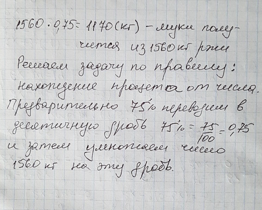 при помощи ржи получают 75 процентов муки. Сколько килограммов муки получиться при помоле 1560 кг ржи?