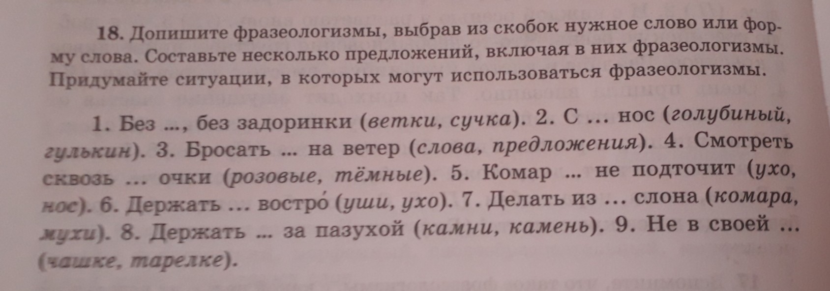 1) Без 2 , без задоринки. 2) С гулькин нос. 3)Бросать слова на ветер.4)Смотреть через розовые очки. 5)Комар нос не подточит. 6)Держать ухо востро. 7)Делать из мухи слона. 8)Держать камень за пазухой. 9)не в своей тарелке.