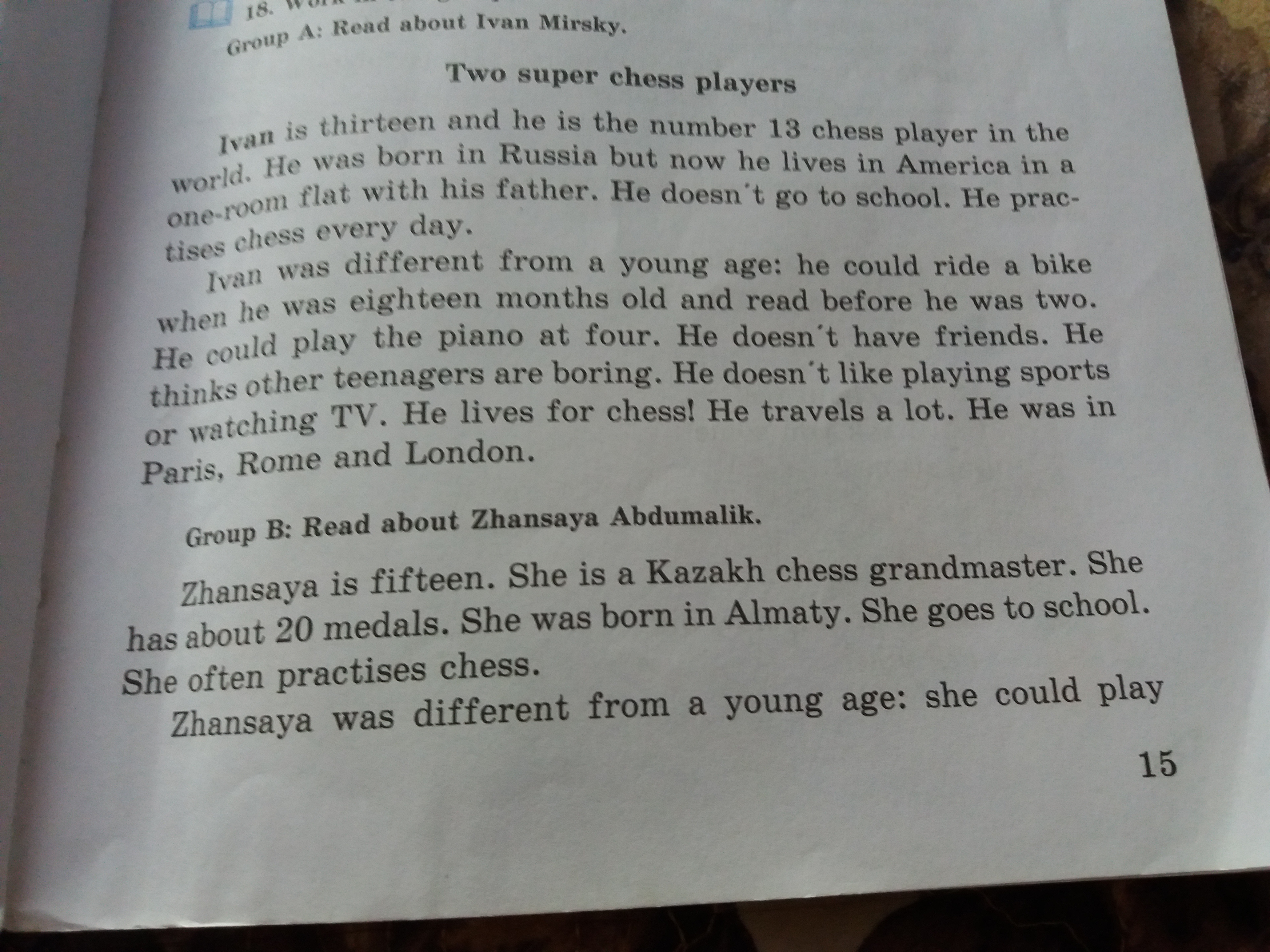 1. Ивану тринадцать и он тринадцатый шахматист в мировом рейтинге. Он родился в России, но сейчас живет в Америке в однокомнатной квартире со своим отцом.Он не ходит в школу. Он практикуется в шахматах каждый день.