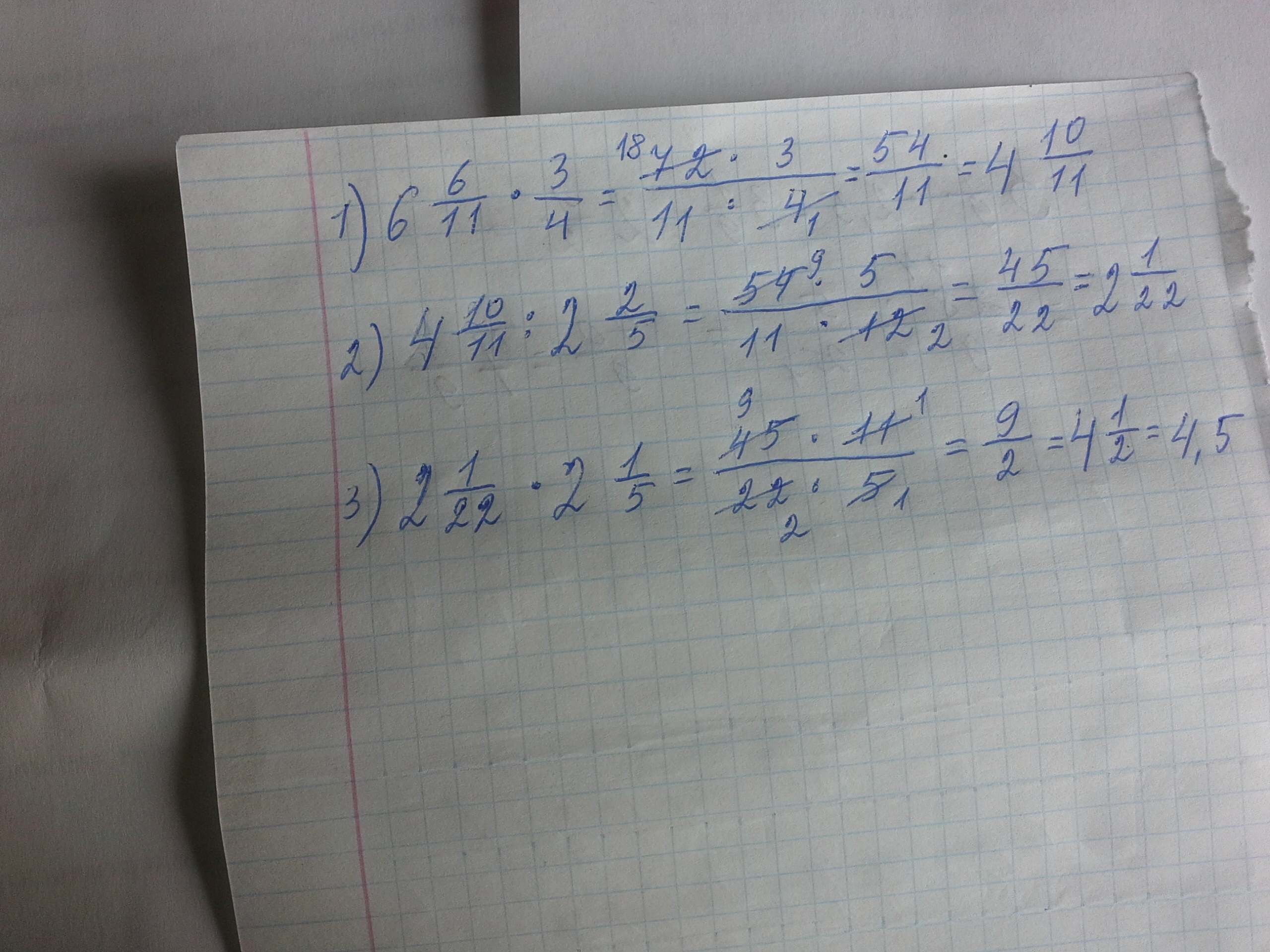 6 6/11 * 3/4: 2 2/5*2 1/5=72/11 * 3/4 : 12/5 * 11/5 = (72*3*5*11)/(11*4*12*5) = 4,5