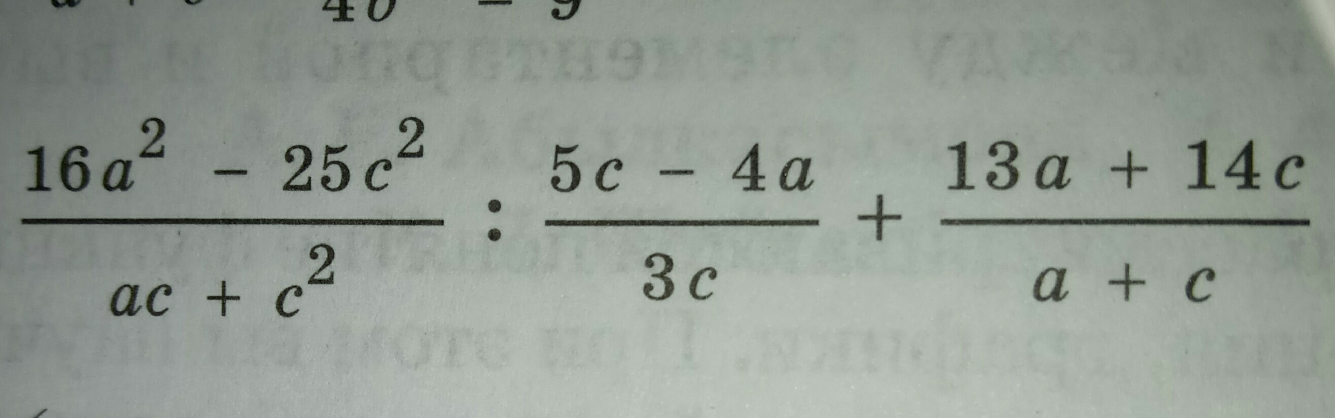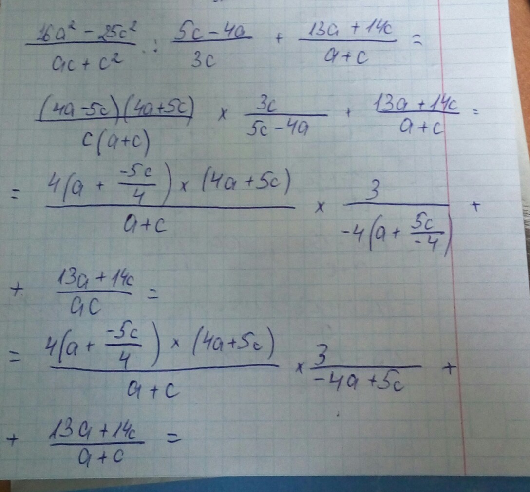 4(a-5c/4)×(4a+5c)/ac × 3/ -4(a+5c/-4)+13a+14c/ac= -3(4a+5c)/a+c + 13a+14c/ac= -12a+15c/a+c +13a+14c/a+c=-(12a+15c)+13a+14c/a+c=a-c/a+c