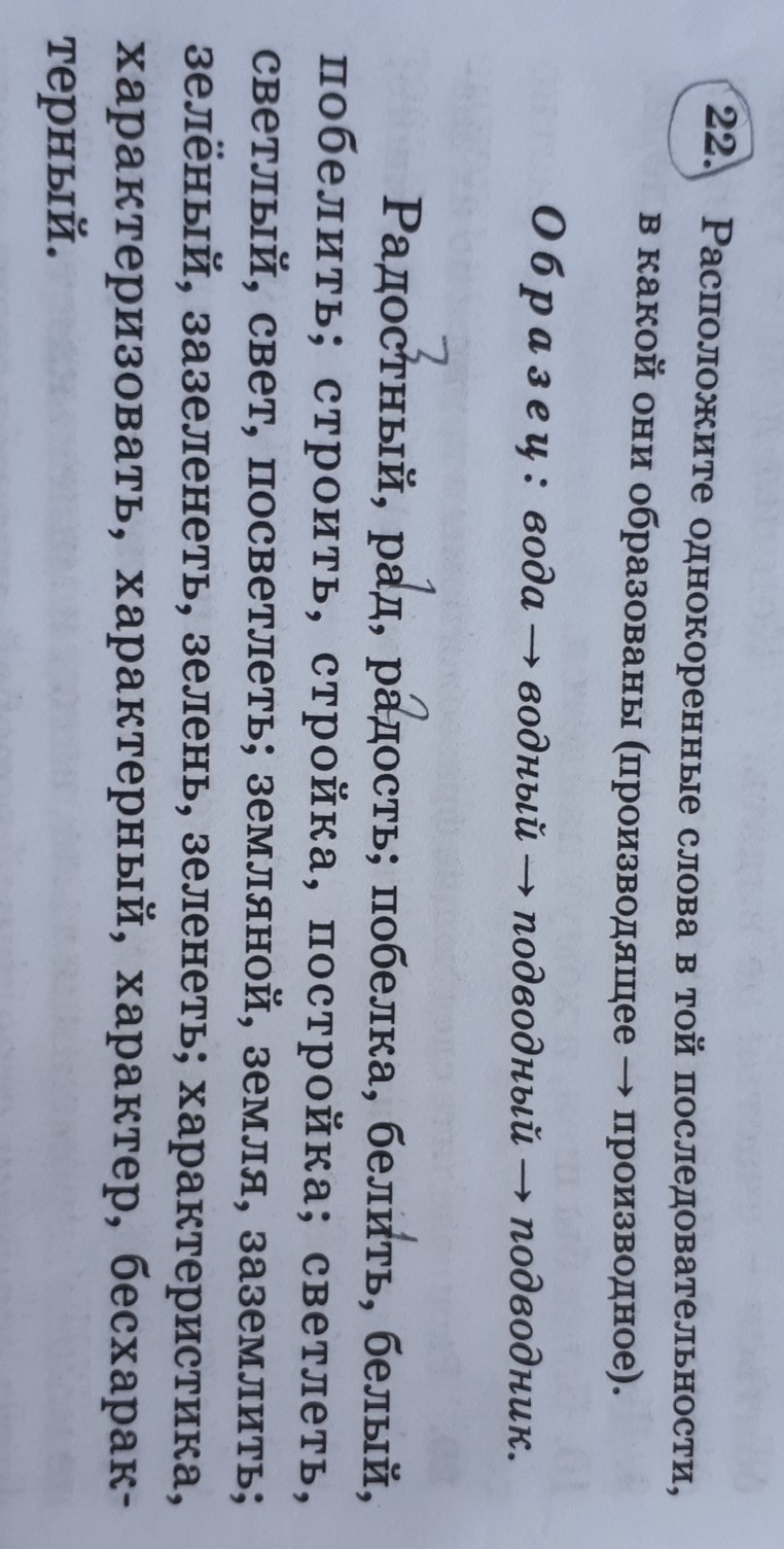 белый-побелка-белить-побелить;стройка-постройка-строить; свет-светлый-светлеть-посветлеть;земля-земляной-заземлить;зелень-зеленый-зеленеть-зазеленеть; характер-характерный-характеристика-характеризовать-бесхарактерный.