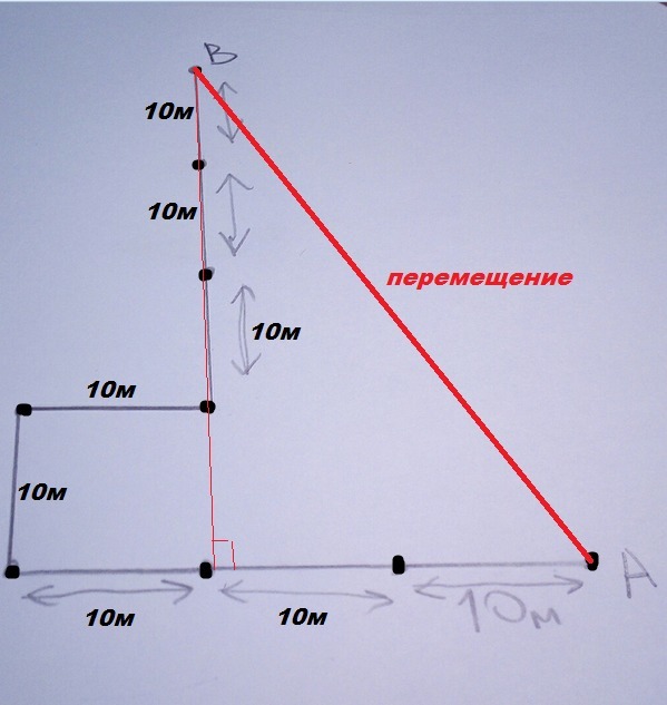 Можно увидеть на рисунке прямоугольный треугольник и, зная стороны, найдём гипотенузу, которая как раз-таки и будет перемещением.
