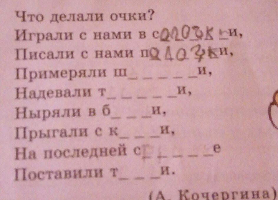 шапочки, тапочки, бочки, кочки, строчке, точки