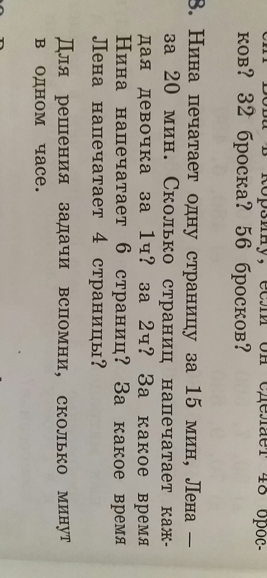 помогите...Нина печатает одну страницу за 15 мин,Лена за 20 мин.сколько страниц напечатает каждая девочка за 1ч.?за 2 ч?за какое