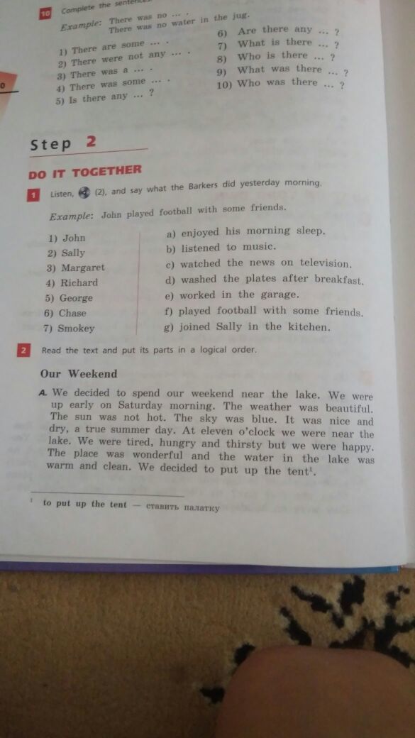 Мы решили провести наши выходные рядом с озером. Мы проснулись рано утром в субботу . Погода была прекрасной. Солнце было не жарким .небо было голубым . День был хорошим и сухим , настоящий летний день . В 11 мы были рядом с озером . Мы устали , проголодались и сильно хотели пить но мы были счастливы. Место было восхетительное и вода в озере была теплой и чистой мы решили поставить палатку