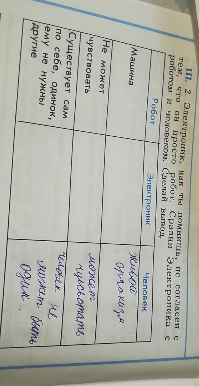 Электроник, как ты помнишь не согласен с тем, что он просто робот. Сравни Электроника с роботом и человеком. Сделай вывод. Помогите срочно!!!