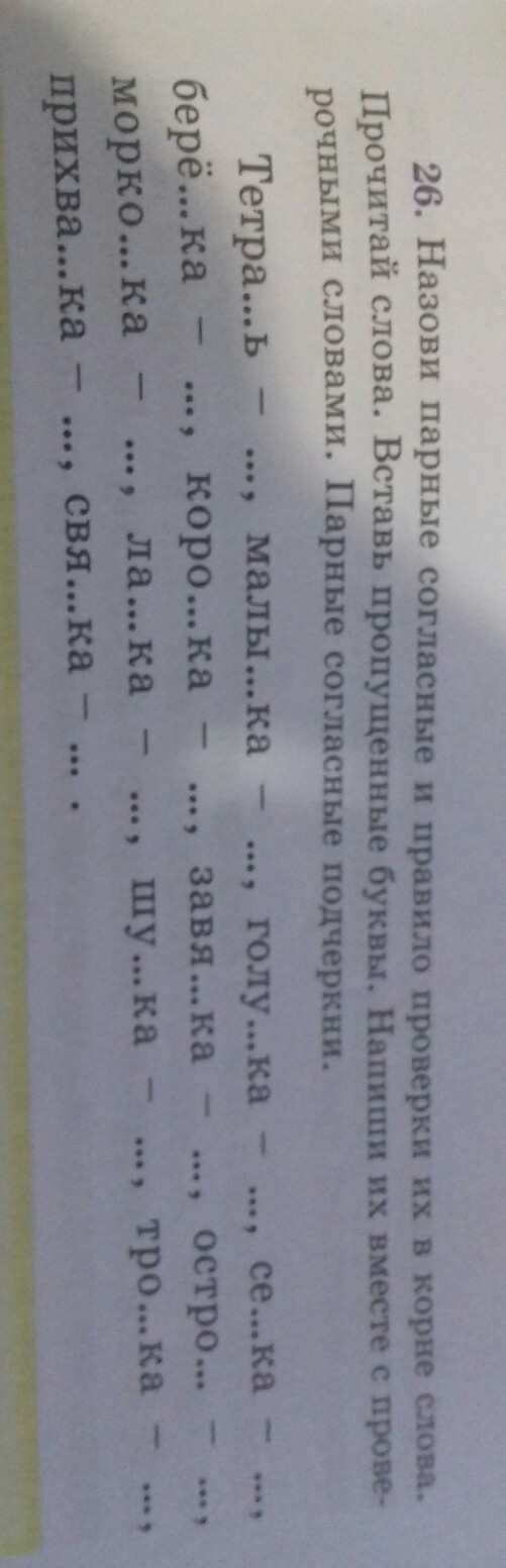 Тетрадь- тетради, малышка- малышок, голубка- голубок, сетка- сеточка, берёзка- берёза, коровка- корова, завязка- завязать, остров- островок, морковка- моркови, лавка- лавочка, шутка- шуточка, связка- связать. предпоследние два слова не поняла.