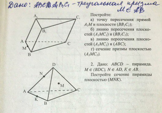 Продолжим прямую DM до пересечения с ребром ВС грани АВС. Получим точку Т, которая принадлежит плоскости ADT и плоскости АВС. Точки N и М принадлежат плоскости ADT, так как лежат на прямых AD и DT.