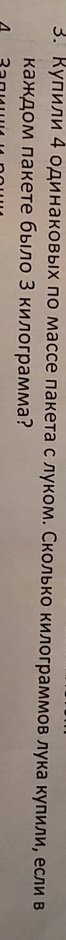 купили 4 одинаковых по массе пакетов с луком сколько килограммов лука купили если в каждом пакете было 3 кг?