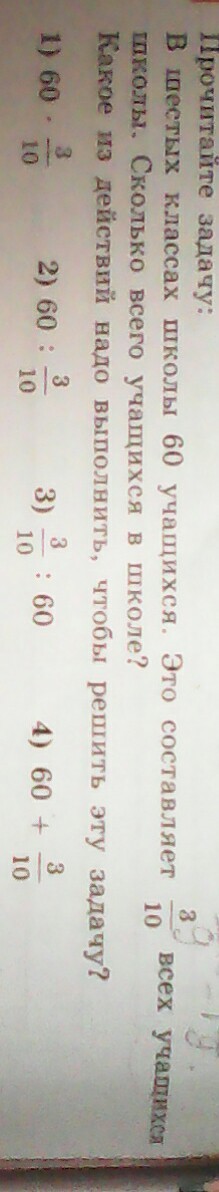 в 6 классах школы 60 учеников . это составляет 3/10 всех учеников школы . сколько всего учеников в школе ? какое из действий надо выполнить , чтобы решить эту задачу ?