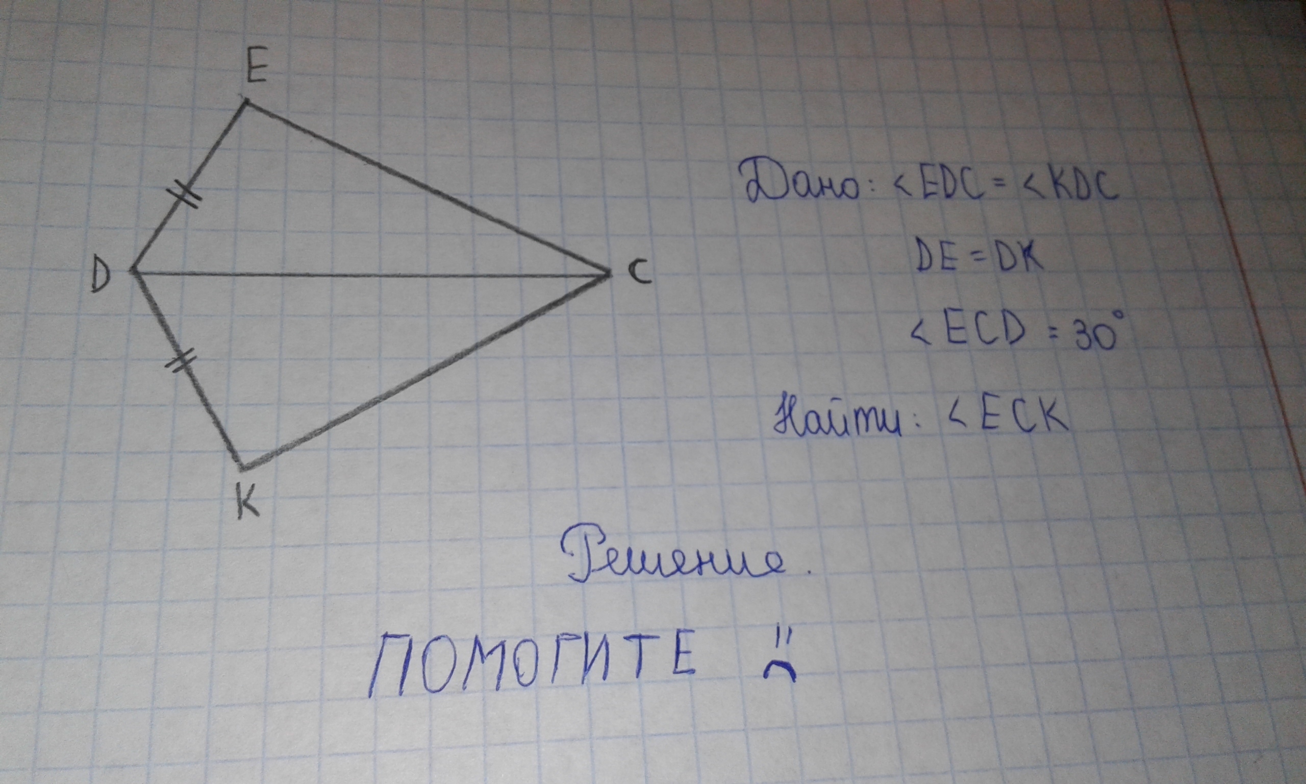 Так как ЕСD=30°,а ЕDC,KDС равны,то ЕСK составляет 1/2 ЕСD,следовательно нужно ЕСD × 2=ECK