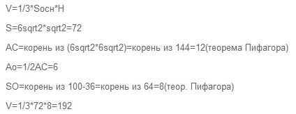 в правильной четырехугольной пирамиде sabcd с основанием abcd боковое ребро sc равно 10, сторона основания равна 6√2. Найдите обьем пирамиды.