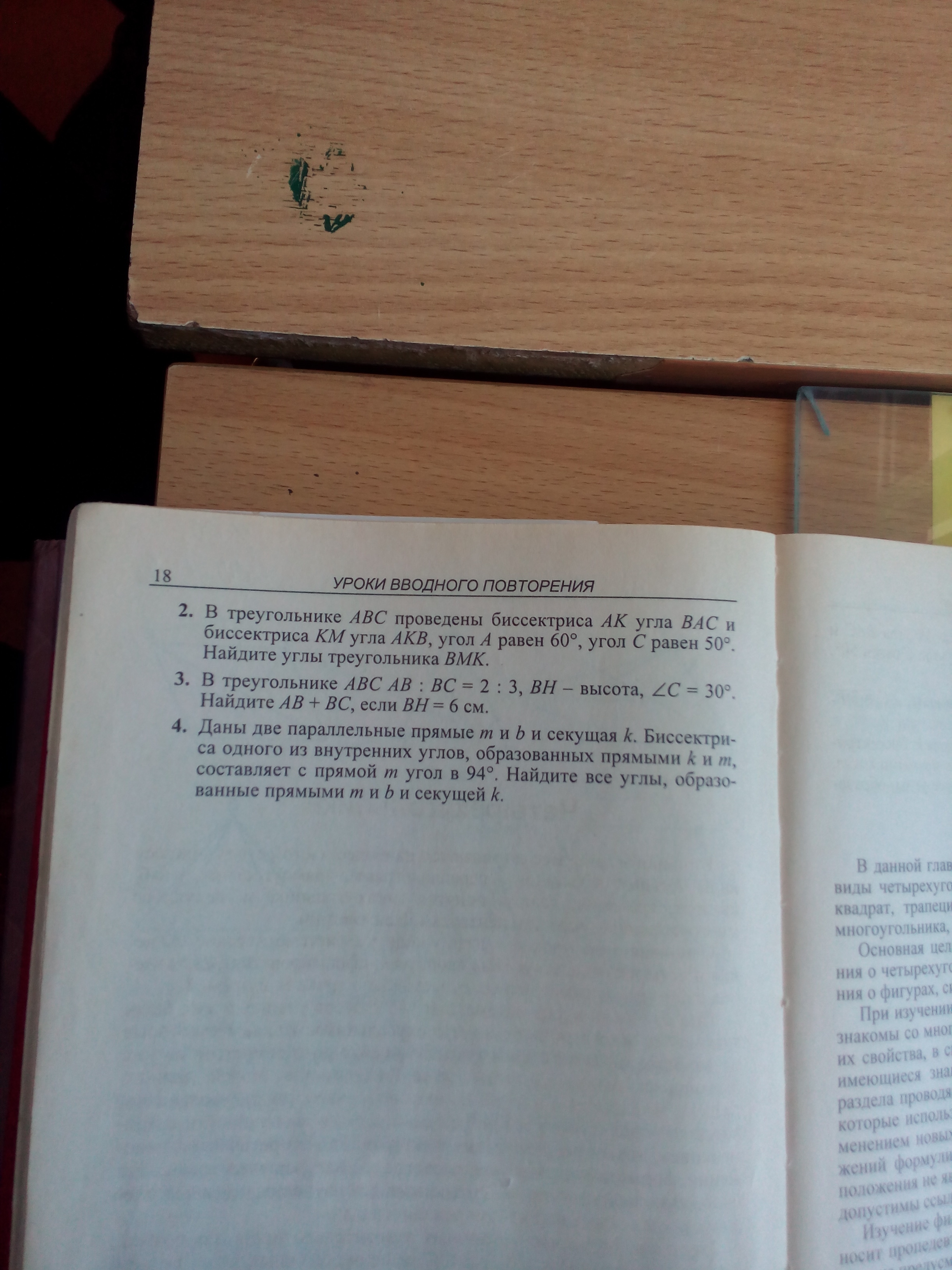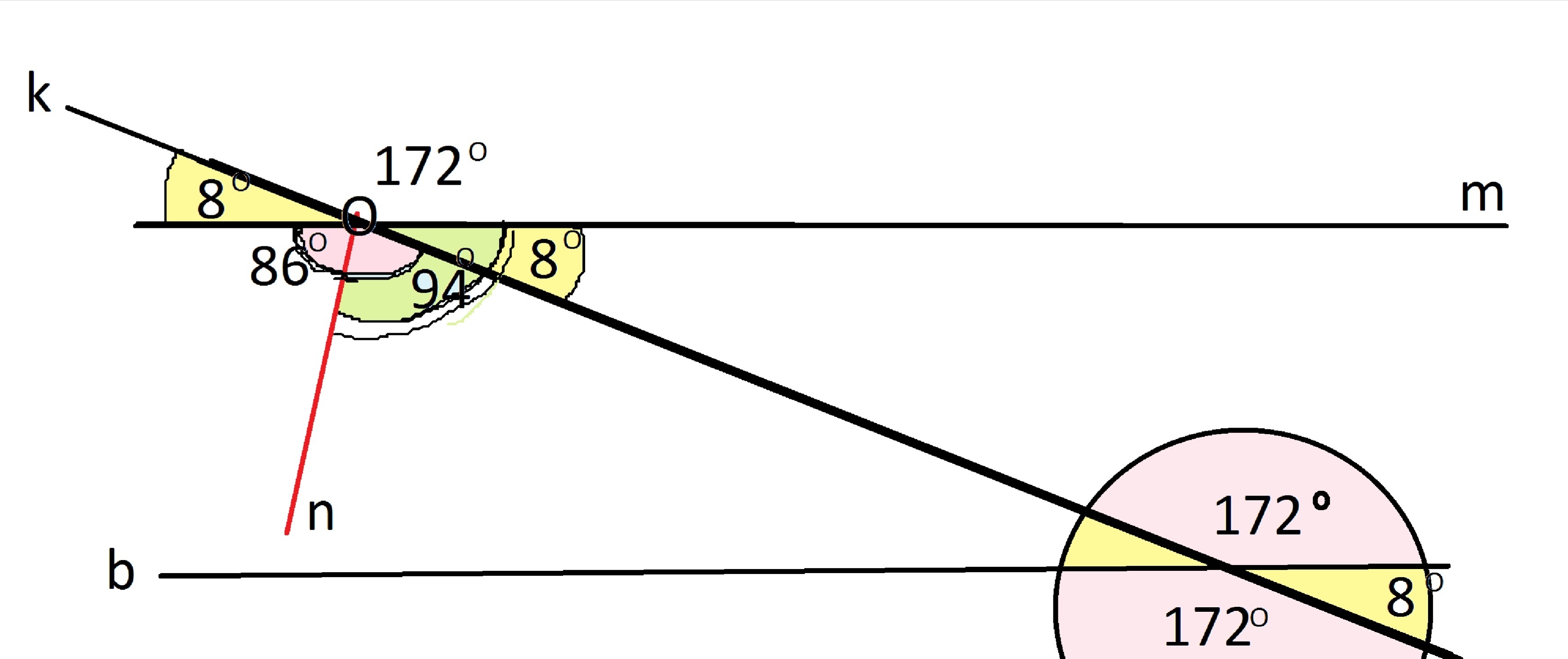 Помогите пожалуйста , даны две параллельные прямые m и b и секущая k. Биссектриса одного из внутренних углов, образованных прямыми k и m, составляет с прямой m угол 94°. Найдите все углы, образованные прямыми m и b и секущей k.